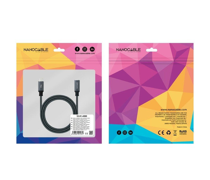 | Características | - Cable prolongador USB-C macho a hembra - El cable ofrece hasta 5 amperios 100W de carga. - Velocidad de transferencia de datos de hasta 20Gbps. - Compatible con vídeo hasta 4k a 60Hz. - Compatible con puertos con Thunderbolt™ 3. - Certificación USB-IF - Cable mallado de algodón. - Longitud: 1 metro Dimensiones y peso - 135 x 180 x 15 mm - 0,045 Kg |