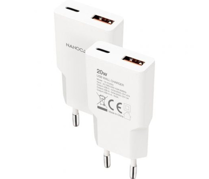 Cargador USB-C/PD 20W + USB-A/QC 20W, Blanco