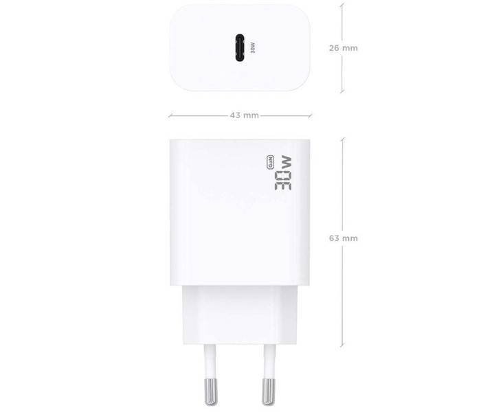 - Cargador GaN USB-C 30W para cargar portátiles, móviles, cámaras y tablets etc. Diseño muy elegante, moderno y práctico.- Este cargardor cuenta con la tecnología GaN que ofrece una serie de ventajas, incluyendo una mayor eficiencia energética, menor generación de calor, mayor capacidad de corriente y menor tamaño y peso en comparación con los cargadores tradicionales de silicio. Estas ventajas hacen que los cargadores GaN sean una opción cada vez más popular para usuarios que buscan una carga más rápida, eficiente y sostenible.- Tecnología AI (chip inteligente) incorporado que detecta el tipo de protocolo del dispositivo conectado para maximizar tanto la compatibilidad como la velocidad de carga.- Cargue su dispositivo USB-C de forma fácil y sencilla.- Múltiples protecciones contra sobrecarga, cortocircuito, lo que garantiza la máxima seguridad para su dispositivo.Especificaciones:- Cantidad de puertos USB-C: 1- Entrada: 100-240V 50-60Hz 0.8A- Salida USB-C: 5.0V 3.0A, 9.0V 3.0A, 12.0V 2.5A, 15.0V 2.0A, 20.0V 1.5A (30W) PPS: 5V-11V 3.0A, 5V-16V 2.0A (33W)- Potencia total: 33W- Nivel de eficiencia: VI- Compatible con la mayoria de los dispositivos USB-C tales como portátiles, teléfonos móviles, smartphones, tablets, GPS, MP3, MP4, consolas de videojuego etc.- Soporta PD3.0 para poder cargar dispositivos inteligentes con tecnología PD3.0 de forma muy rápida.- Aparte de soportar protocolo PD3.0, este cargador también soporta los siguientes protocolos:- PPS: 5V-11V 3.0A, 5V-16V 2.0A- QC3.0: 3.4V-12.03V- QC2.0 / QC4.0: 5V, 9V, 12V- HUAWEI FCP: 5V, 9V- HUAWEI SCP: 3.3-12V- SAMSUNG AFC: 9V, 12V- APPLE: 5V 2.4A- BC1.2: DCP 5V 1.5A- Está fabricado con material ignífugo e incluye múltiples protecciones contra sobrecarga, cortocircuito, lo que garantiza la máxima seguridad para su dispositivo.- Longitud: N/A- Color: Blanco- Normativas: RoHS, CE- Test de funcionamiento: 100% testeadoContenido del paquete:- 1 x Cargador GaN 30W
