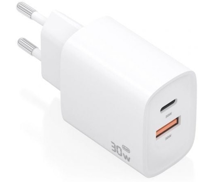 A110-0952 – Cargador GaN 30W, 1xUSB-C PD3.0 QC4.0, 1xUSB-A QC3.0, Blanco