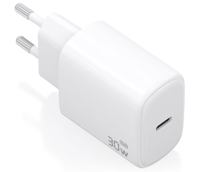 Cargador GaN USB-C de 30W diseñado para cargar portátiles, teléfonos móviles, cámaras y tablets, entre otros dispositivos. Presenta un diseño elegante, moderno y práctico.