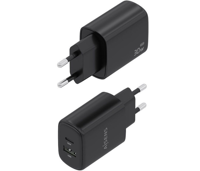 AISENS - CARGADOR GaN 30W, 1xUSB-C PD3.0 QC4.0, 1xUSB-A QC3.0, NEGRO