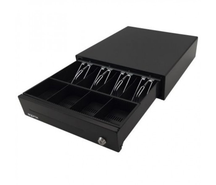 El APPCASH33 es un cajón portamonedas compacto y eléctrico, fabricado con material muy resistente al impacto.