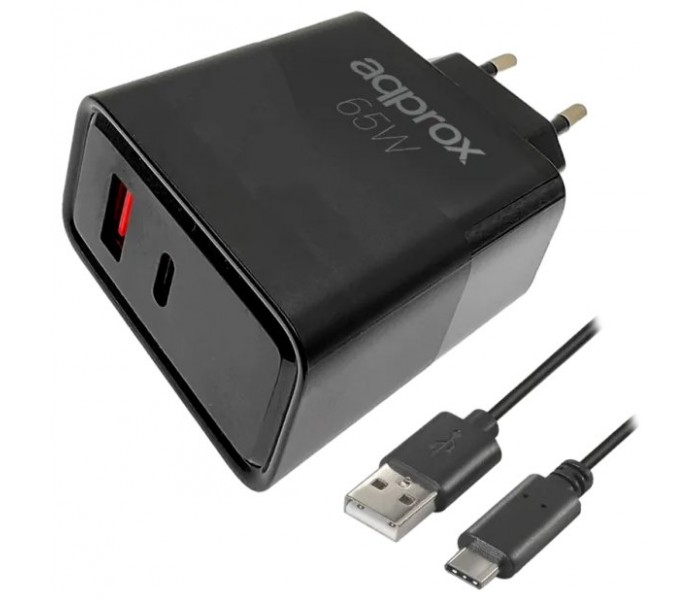 . Carga rápida PD 3.0 y QC 3.0.. Entrada: 100 - 240 VAC 50 / 60Hz 0,8 A.. Salida USB-C: 5 VDC / 3,0 A; 9 VDC / 3,0 A; 12 VDC / 3,0 A; 15 VDC / 3,0 A; 20 VDC / 3,25 A.. Salida USB-A: 5 VDC / 3,0 A; 9 VDC / 2,0 A; 12 VDC / 1,5 A.. Potencia USB-C: 65 W máx.. Potencia USB-A: 18 W máx.. Cable USB-C a USB-A de 1 m incluido.. Material: Plástico Ignífugo.. Color: Negro.. Peso: 108 g.. Dimensiones: 54 x 28 x 54 mm..CARGADOR USB DE VIAJE/PARED 1xUSB/USB-C + CABLE USB-A A USB-C 65W NEGRO APPROX