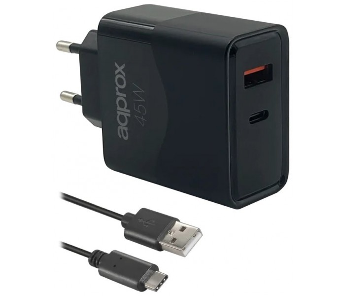 CARGADOR USB DE VIAJE/PARED 1xUSB/USB-C + CABLE USB-A A USB-C 45W NEGRO APPROX