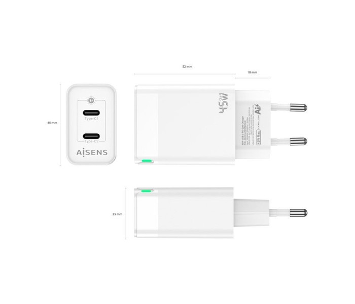 CARGADOR GAN AISENS 45W 2XUSB-C PD3.0 QC4.0 BLANCO