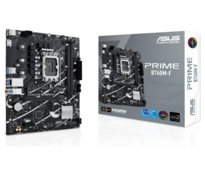 ASUS PRIME B760M-F, una placa base micro-ATX Intel® B760 LGA 1700 con PCIe 4.0, dos ranuras PCIe 4.0 M.2, DDR5, Ethernet Realtek de 1 Gb, HDMI™, SATA 6 Gbps, puertos USB frontales de 5 Gbps y Aura Sync.