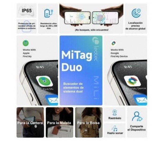Descubre el nuevo MiTag Duo de leotec, el primer rastreador Bluetooth del mundo con certificación oficial de Apple y Google. Con compatibilidad universal, diseño robusto y una conectividad sin igual, es la solución definitiva para quienes desean cuidar y encontrar lo que más valoran: llaves, cartera, mochila, coche, equipaje, mascotas y mucho más, todo desde su móvil, estés donde estés.