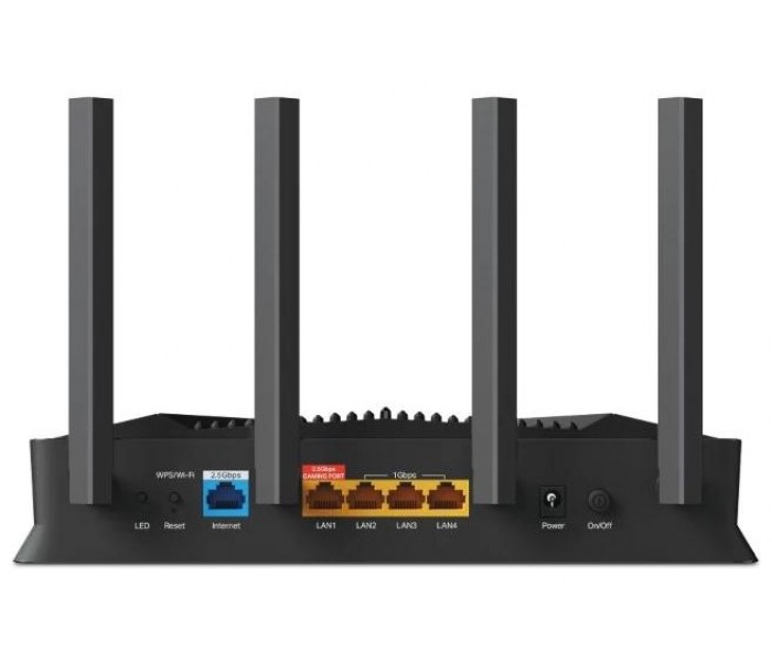 Hardware | Puertos Ethernet - 1 x WAN de 2,5 Gbps - 1 x LAN de 2,5 Gbps - 3 x LAN de 1 Gbps Compatibilidad con USB - 1 x USB 3.0 - Formatos de partición compatibles: NTFS, exFAT, HFS+, FAT32 - Funciones compatibles: Servidor FTP Servidor multimedia Servidor Samba Botones - Botón de encendido/apagado - Botón LED - Botón WPS - Botón de reinicio Alimentación - 12 V ? 2 A |