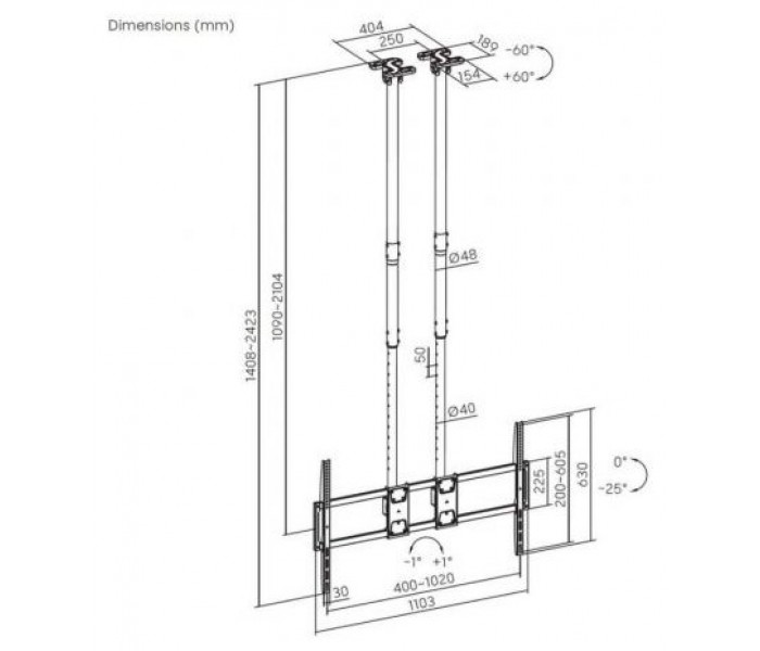 CT120TLE-395 – Soporte de Techo PRO Inclinable, Extensible y Nivelable para Monitor/TV 120kg de 60-120, Negro