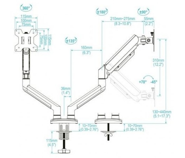 - Peso soportado de pantalla: Mínimo 2 kg, Máximo 10 kg por cada brazo