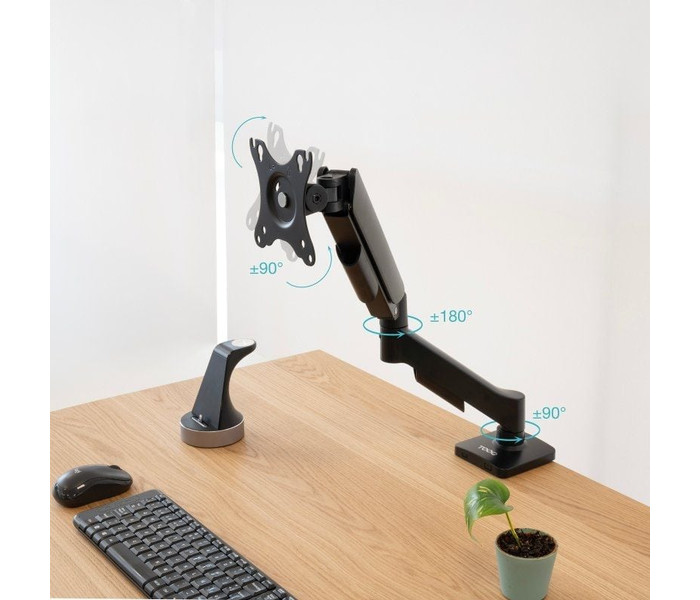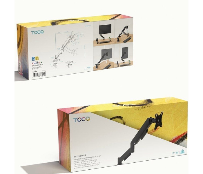 Especificaciones. . Pantallas soportadas: 17""-32"". Compatible con VESA: 75x75 y 100x100. Peso soportado de pantalla: Mínimo 2 kg. Máximo 9 kg. Brazo regulable con pistón de gas. ángulo de inclinación: +90º/-90º. ángulo de giro: +90º/-90º. ángulo de rotación: +180º/-180º. Altura ajustable hasta 415 mm. Extensión máxima del brazo: 450 mm. Instalación mediante abrazadera o tornillo pasante. Sistema de organización de cables. Compatible con pantallas curvas. Color: Negro. Material: fabricado en acero de alta calidad. Peso neto: 2,20 kg. Peso bruto: 2,48 kg. Medidas del embalaje: 375x155x66 mm