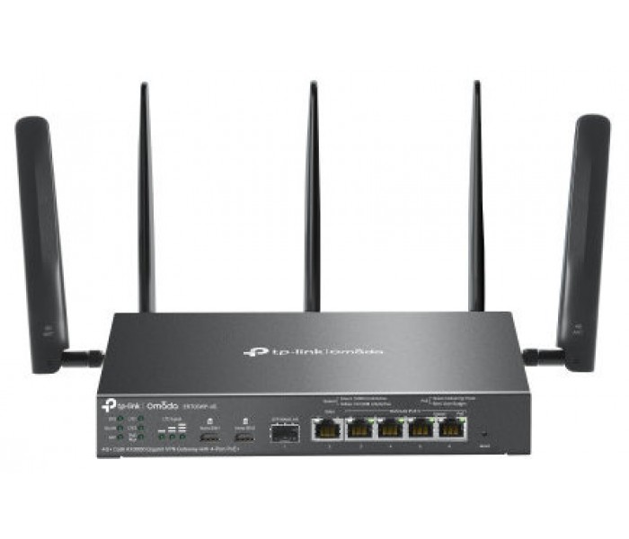 TP-Link ER706WP-4G. Tipo de conexión WAN: RJ-45. Banda Wi-Fi: Doble banda (2,4 GHz / 5 GHz), Tasa de transferencia de datos WLAN (máx.): 300 Mbit/s, Modulación: OFDMA. Tipo de interfaz Ethernet LAN: Gigabit Ethernet, Ethernet LAN, velocidad de transferencia de datos: 10,100,1000 Mbit/s, Soporte VPN: IPsec VPN PPTP VPN L2TP VPN OpenVPN WireGuard VPN. Generación de red móvil: 4G, Admite bandas 4G: 800,850,900,1500,1700,1800,1900,2000,2300,2400,2500,2600,3400,3500,3600,3700 MHz, Tipo de tarjeta SIM: NanoSIM. Algoritmos de seguridad soportados: IPSec, SNMP, SNMPv2, SNMPv3, WPA, WPA2, WPA3-Personal, NAT, funcionalidad: DHCP, PPPoE, L2TP, PPTP