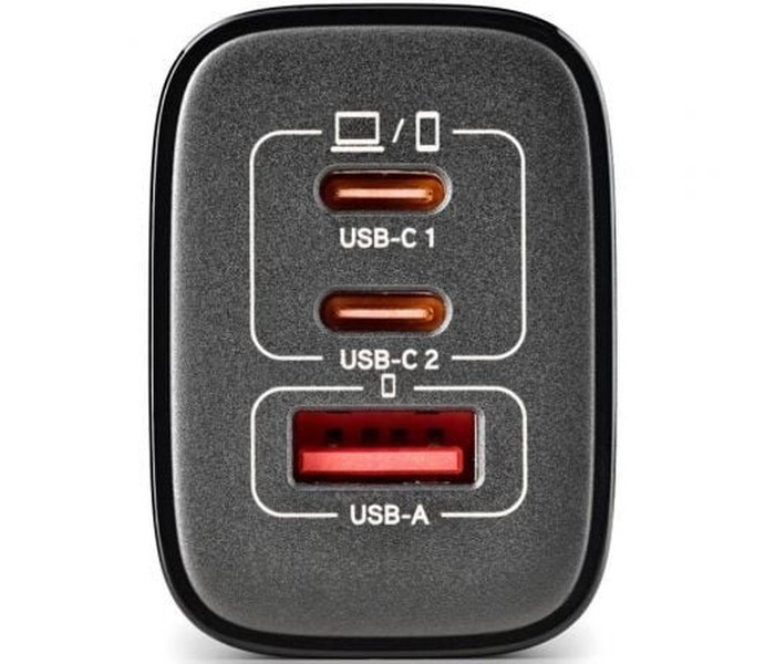 - Cargador GaN de pared con 2 salidas USB-C (PD & PPS) y una salida USB-A QC 3.0 de 65W de potencia máxima para cargar dispositivos de manera rápida y eficiente.