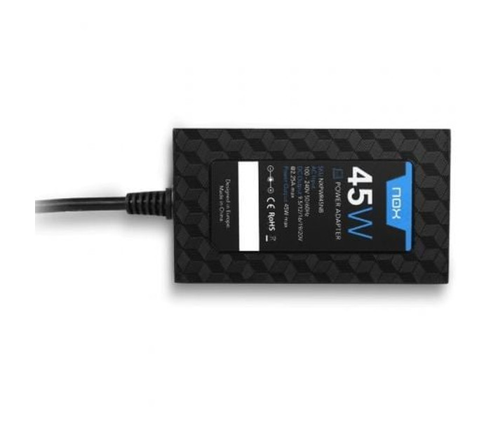 En Nox no queremos que te quedes sin energía en ningún sitio, por ello, hemos diseñado este cargador universal de corriente para portátil con regulación automática de voltaje. Dispone de 10 conectores distintos: 15V (Toshiba), 16V (IBM), 16V (Sony, Fujitsu), 18,5V (Compaq), 18,5V (HP, Compaq) 19V (Acer, Asus, Compaq, Dell, Fujitsu, Gateway, Toshiba, Lenovo, Liteon), 19V (Samsung), 19V (Acer, Compaq, HP, Fujitsu, Gateway, Toshiba, Liteon), 19,5V (Sony), 20V (Lenovo), los cuales abarcan la mayoría de las principales marcas de portátiles del mercado.
