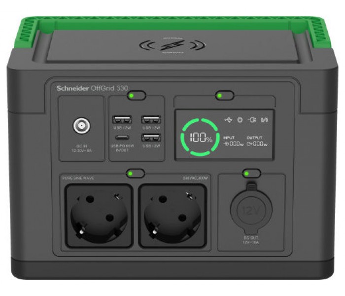 APC PPS330-GR. Tecnología de batería: Ión de litio, Fuente de carga: CC, Solar, USB, Capacidad de batería: 332 Wh. Color del producto: Negro, Verde, Material de la carcasa: Plástico, Tipo de visualizador: LCD. Interfaz de entrada: DC + USB Type-C, Cantidad de salidas AC: 2 salidas AC, Conector USB: USB tipo A, USB Tipo C. Ancho: 162,6 mm, Profundidad: 221 mm, Altura: 152,4 mm. Cables incluidos: Encendedor de cigarrillos