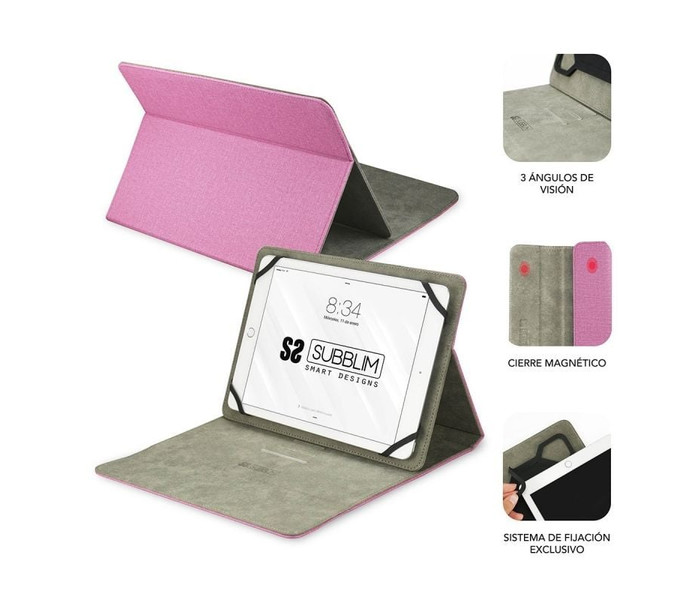 CLEVER STAND CASE, es una funda universal para proteger tu Tablet. Su estilo es moderno y elegante, desarrollado por diseñadores con las preferencias del usuario. El acabado exterior con acabado en tacto Cloth y el exquisito cosido le dan al producto un aspecto de alta calidad.El soporte antideslizante permite colocar la Tablet en varios ángulos de visión. Los puertos de conexión y botones permanecen accesibles incluso cuando su Tablet está en la funda, con grandes aberturas en todos los lados.Cuatro elegantes coloresLa gama de colores más demandada y con mejor acogida por parte del usuario final con un elegante acabado en tacto Cloth.Cierre MagnéticoDisfruta de su cierre magnético que además de elegancia, ofrece una alta seguridad facilitando su transporte.Exclusivo Sistema de SujeciónTiene un sistema único de fijación de tu Tablet en la funda mediante una silicona ultrarresistente que se adapta a las cuatro esquinas de tu dispositivo con una total compatibilidad y sin dañar tu pantalla.
