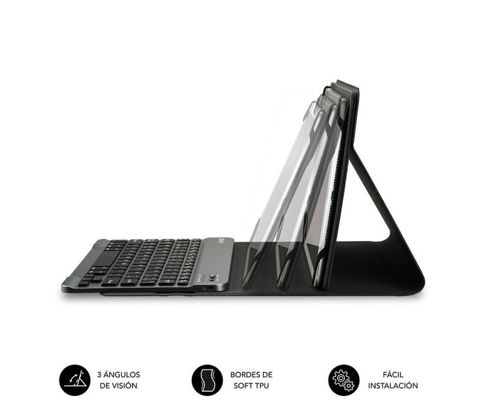 - Exclusivo sistema de sujeción de la Tablet mediante molde de silicona. No daña la pantalla de tu dispositivo y se adapta al teclado extraíble Bluetooth