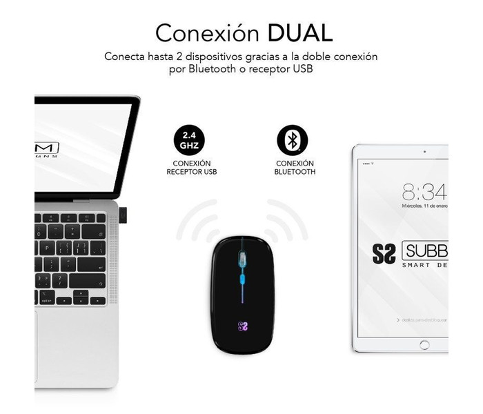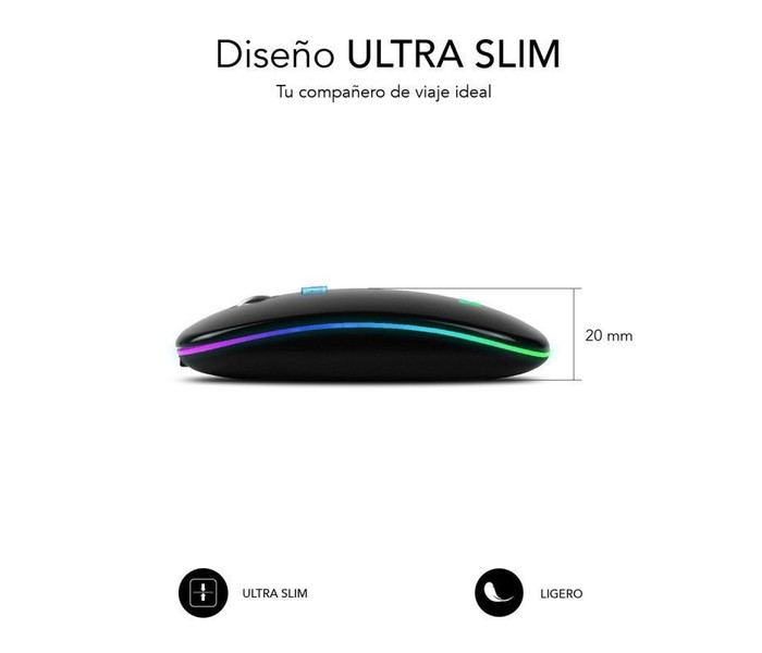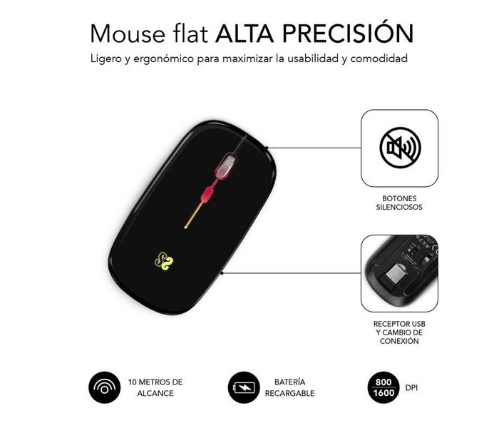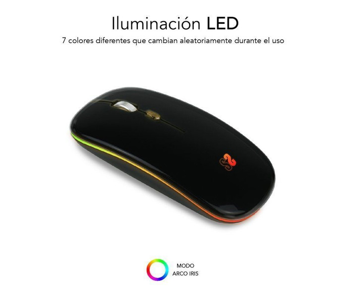 Este ratón es de los más completos del mercado. Es dual, lo que permite conectarlo a dos dispositivos usando la conexión bluetooth o el receptor USB. Incluye la tecnología Silent Click para hacerlo silencioso y útil en entornos con otras personas. Además incluye una iluminación led en 7 colores que irán cambiando aleatoriamente durante su uso para que la experiencia sea inmersiva. La batería es integrada y de larga duración para interferir lo menos posible con tu ritmo de trabajo.Dos conexiones en un mismo ratón. Sin duda estamos ante uno de los ratones más completos del mercado. La tecnología dual permite que podamos conectarlo tanto por radiofrecuencia con un receptor USB como por bluetooth, pudiendo llegar a conectar dos dispositivos.Silent Click. El Led Dual Flat Mouse es silencioso para poder llevarlo a cualquier sitio, desde tu trabajo, un centro de estudio, tu casa. La tecnología Silent Click soluciona el molesto clic repetitivo del ratón que puede llegar a desconcentrarnos, los botones del ratón son silenciosos.Batería Li-ion Recargable. Sin necesidad de pilas, para que te puedas olvidar de ellas. Esta batería de 500 MHa es de larga duración. Además, nunca te quedarás sin ratón porque puedes seguir trabajando mientras se recarga la batería por USB.Rueda metalizada. Disfruta de las mejores sensaciones con la rueda antideslizante de diseño metalizado. Resulta muy cómoda y tiene un tacto agradable.Luz led. El detalle de luz del ratón Led Dual Flat es ideal para completar el diseño de tu escritorio o despacho o incluso para llevártelo a cualquier parte y aportar un toque de color. Resulta ideal para entornos con una baja iluminación gracias a los 7 colores que cambian aleatoriamente mientras se usa creando un entorno relajanteMáxima precisión. Úsalo en múltiples superficies con alto rendimiento y excelentes resultados, adapta la precisión para trabajar a tu gusto. Cuenta con un sensor óptico con precisión láser de 1600 dpi que proporciona un movimiento suave y sin saltos.Ahorro de energía. Después de un tiempo de inactividad, el ratón pasará automáticamente al modo suspensión para ahorrar batería, así no tendrás que preocuparte por encenderlo o apagarlo cada vez que lo uses. Para activarlo, presiona cualquier tecla y vuelve al trabajo.