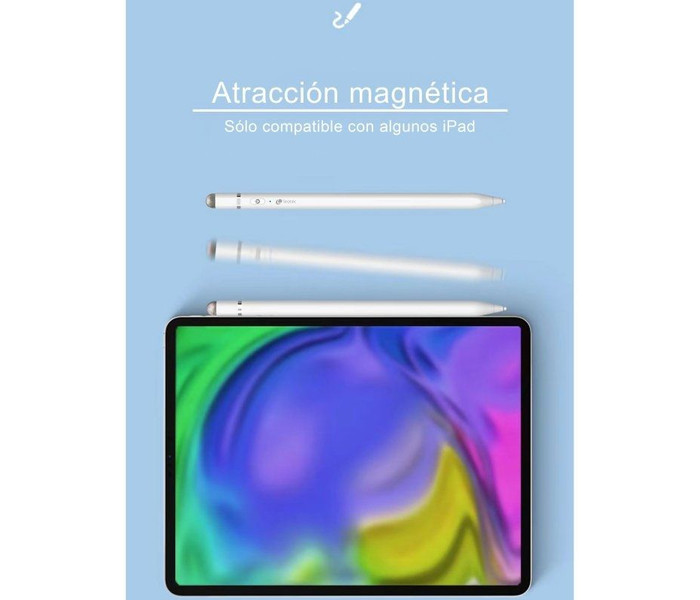 | Características | - Interruptor: encender y apagar - Apagado automático: 60 minutos - Luz indicadora LED: Luz roja 1%-30% de batería -Luz azul 30%-70% de batería Luz verde: 70%-100% - Batería de litio: 140 mAh - Dos formas de carga: Puerto de carga tipo C (para cargar sin cable) Cable USB a tipo C hembra - Entrada: 5V 400mA. - Tiempo de carga: 40 minutos - Tiempo de uso: 10-12 horas - Adsorción magnética en iPad (consultar compatibilidad) - Compatibilidad: Mayoría de los dispositivos de pantalla capacitiva, IOS, Windows, Android - Punta material POM + punta de fibra. Dimensiones y peso - 165 x 8,9 mm - 13 g |