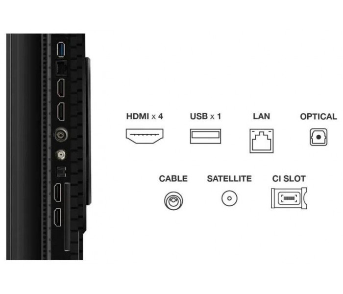 | Conectividad | - Bluetooth 5.4 - WiFi 5 Puertos - 4 x HDMI - 1 x USB - 1 x LAN - 1 x Conector linea optica - 1 x Cable - 1 x Satelite - 1 x Conector del CI |