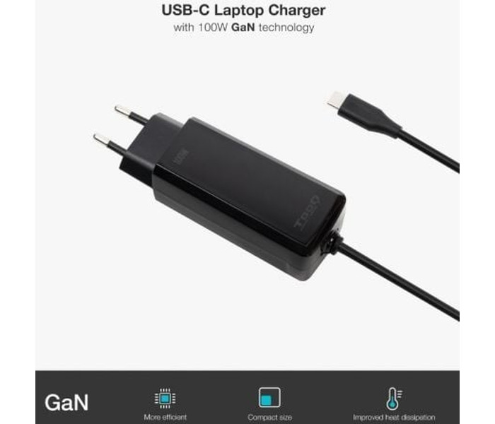 Fabricado con la tecnología Gan (Nitruro de Galio), que permite un suministro de corriente más eficiente disminuyendo las altas temperaturas que soportan los dispositivos.. Entrada: . 110-240V 50/60Hz 1.8A max.. Salidas:. USB-C: DC5V/3A, DC9V/3A, DC12V/3A, DC15V/3A y DC20V/5A. Potencia:. 100W. Válido para todo tipo de dispositivos con conector USB-C de carga. Compatible con MAC. Cable de 1.8 metros. Certificación: . CE, FCC y RoHS. Color:. Negro