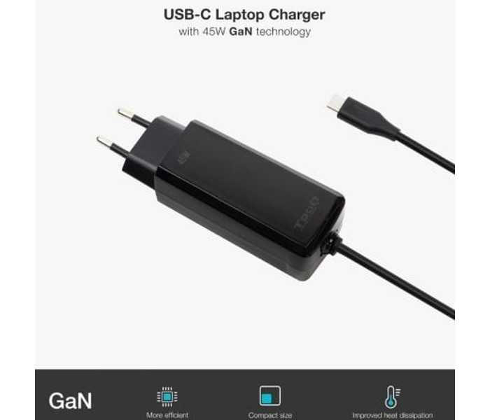 Fabricado con la tecnología Gan (Nitruro de Galio), que permite un suministro de corriente más eficiente disminuyendo las altas temperaturas que soportan los dispositivos.. Entrada: . 110-240V 50/60Hz 1.2A max.. Salidas:. USB-C: DC5V/3A, DC9V/3A, DC12V/3A, DC15V/3A y DC20V/2.25A. Potencia:. 45W. Válido para todo tipo de dispositivos con conector USB-C de carga. Compatible con MAC. Cable de 1.8 metros. Certificación: . CE, FCC y RoHS. Color:. Negro